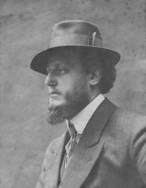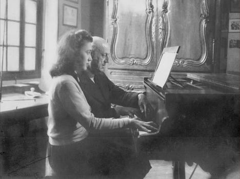 Au piano chez lui, vers 1920. À la fin de sa vie, atteint de surdité, pour entendre, il compose avec une baguette entre les dents appliquée contre l'instrument, les pieds sur un plancher de bois