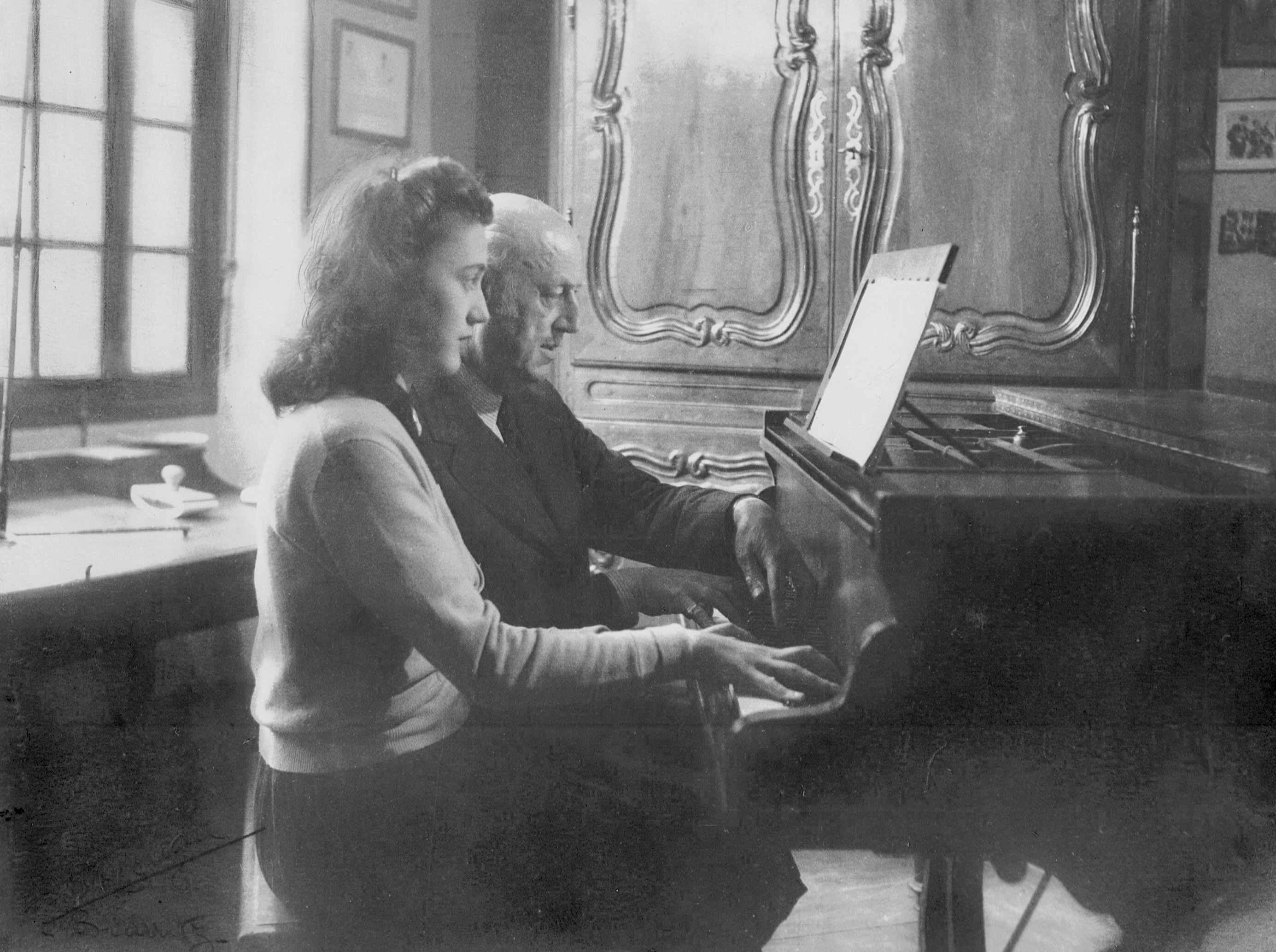 Au piano chez lui, vers 1920. À la fin de sa vie, atteint de surdité, pour entendre, il compose avec une baguette entre les dents appliquée contre l'instrument, les pieds sur un plancher de bois
