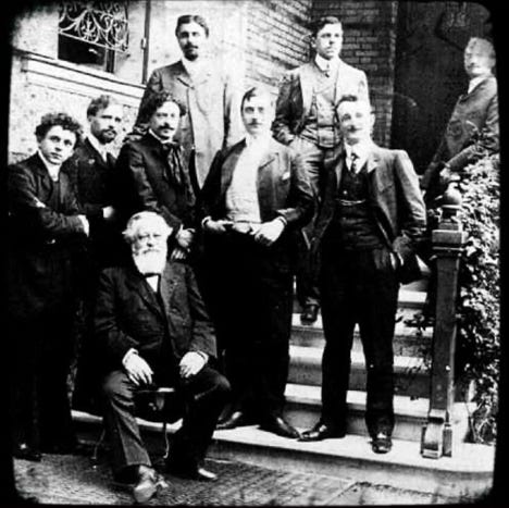 1905, la classe d’Orgue du Conservatoire de Paris photographiée chez leur professeur à Meudon, Alexandre Guilmant, assis. Au 1er rang, Alexandre Cellier, Joseph Boulnois, Achille Philipp, Joseph Bonnet, Paul Fauchet. Au 2ème rang, Augustin Barrié, Ermend Bonnal, Edouard Mignan