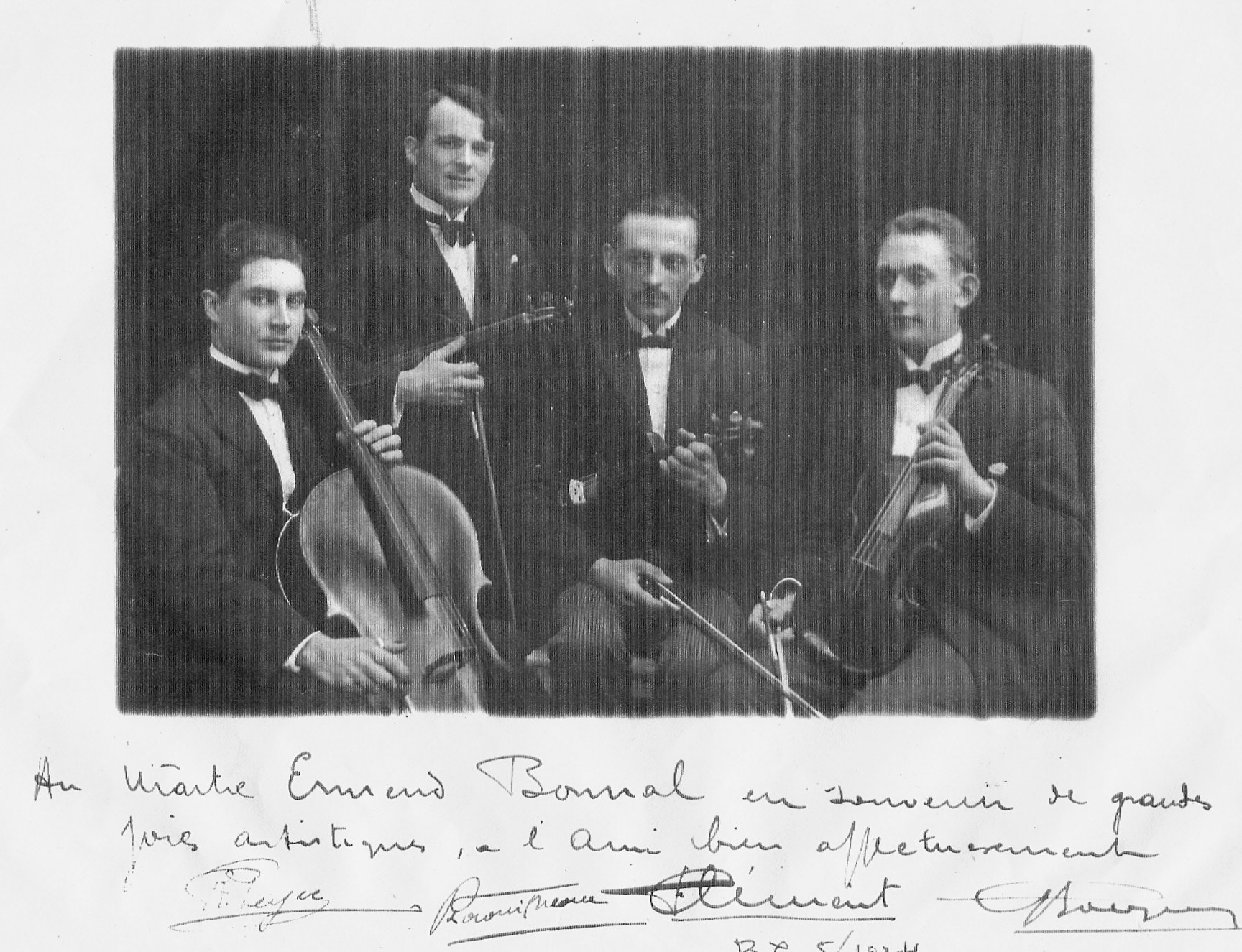 Le Quatuor La Quinte en 1924. François Clément, 1er violon, P. Laouilheau, 2ème violon, G. Bocquet, alto et Roger Peyre, violoncelle.